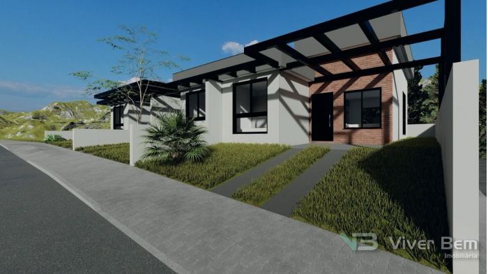 Casas geminadas com 64,89m2, com 2 dormitórios, sala e cozinha, banheiro, área nos fundos, com estacionamento na frente.